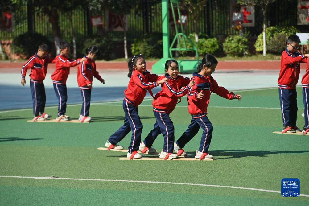 10月16日,在梧州市長洲區龍平小學,學生們在體育課上進行板鞋練習。