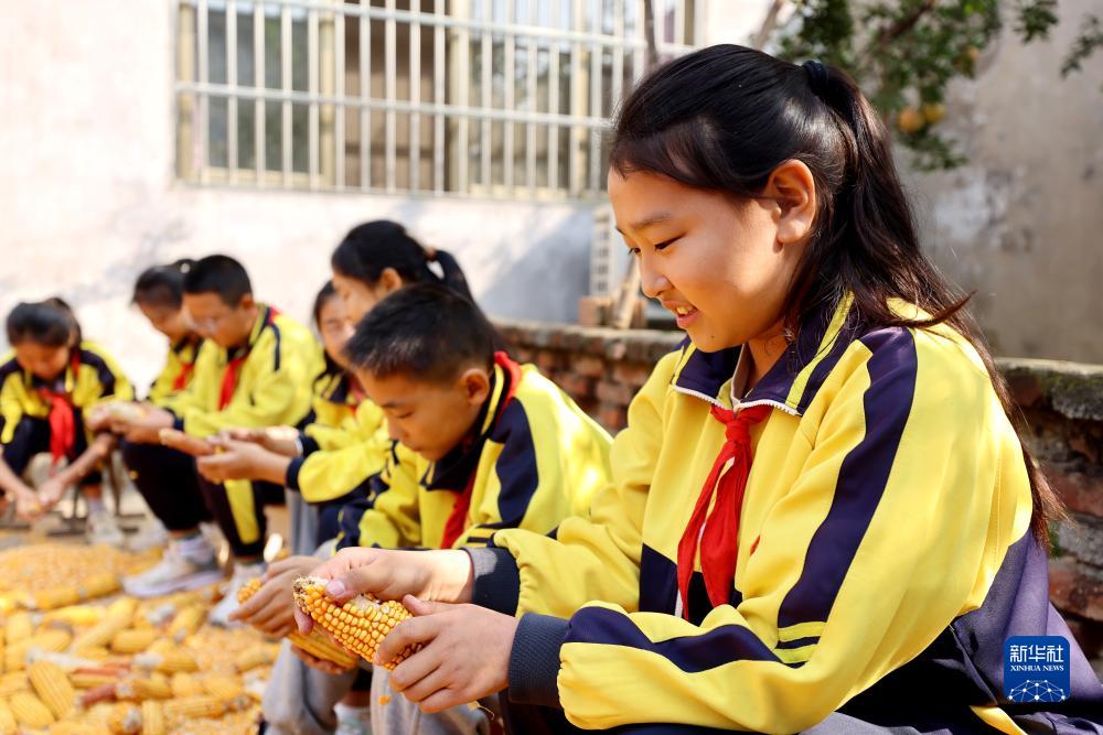 10月16日,山東省棗莊市東山陰小學學生在農家小院幫農民搓玉米。