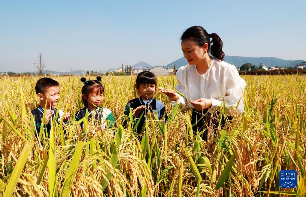 10月16日,江西省新余市渝水區下村鎮中心幼兒園的教師帶領孩子走進稻田,了解水稻知識。