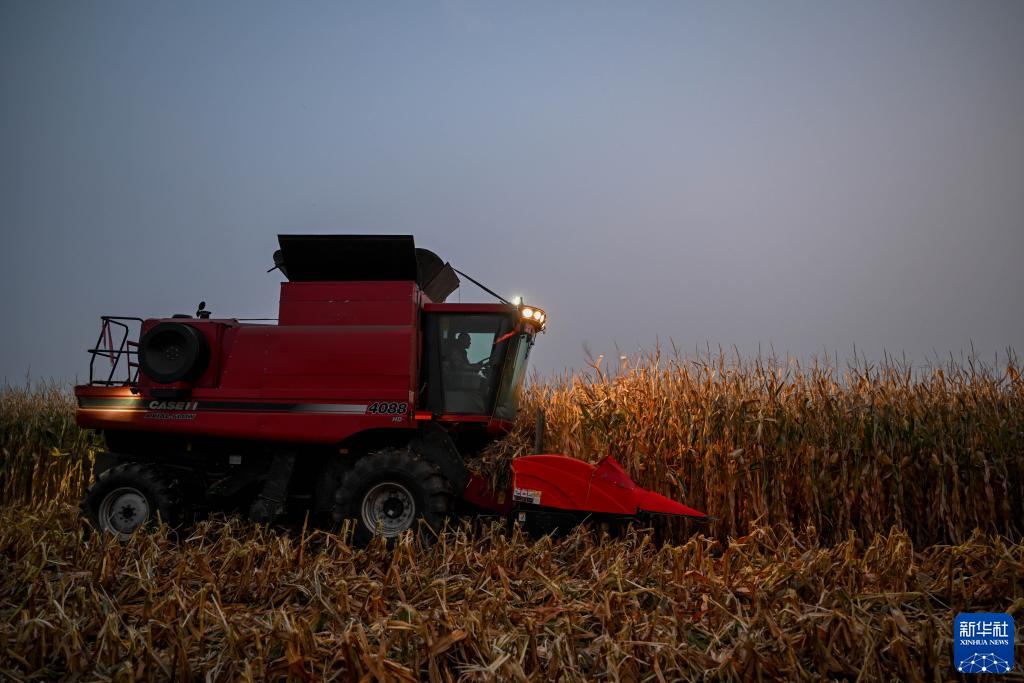 10月13日,農機手在通遼市科爾沁區豐田鎮哈拉滿罕村駕駛收割機搶收玉米。