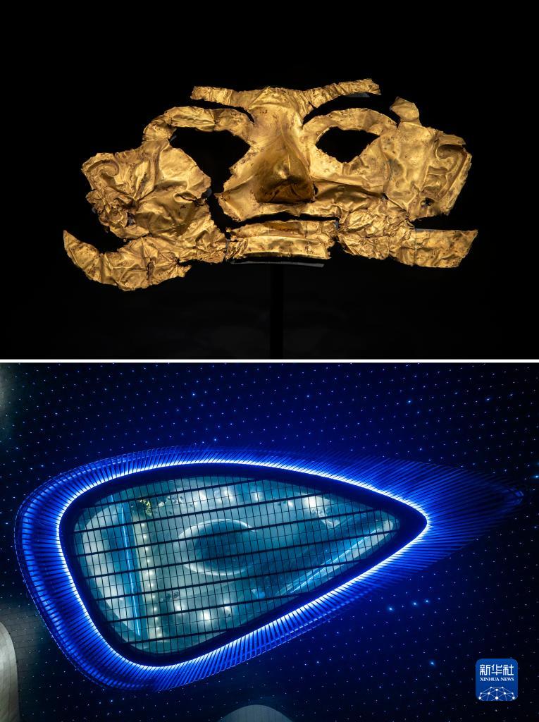 這是一張拼版圖片,上圖為:在位于四川廣漢市的三星堆博物館拍攝的金面具(2021年3月17日攝);下圖為:10月16日晚拍攝的2023成都世界科幻大會主場館——成都科幻館屋頂的“科幻之眼”(無人機照片)。這是屋頂內嵌的一塊面積為1382平方米的玻璃采光頂,寓意宇宙年齡138.2億年,其設計元素來源于三星堆金面具上的“古蜀之眼”。
