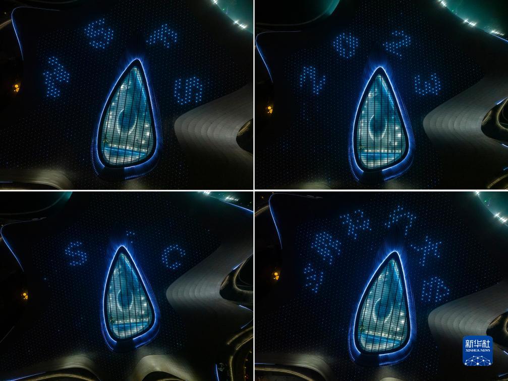 這是10月16日晚拍攝的2023成都世界科幻大會主場館——成都科幻館,燈光在其屋頂上打出“WSFS(世界科幻協會)”“2023”“SC(四川)”“世界科幻大會”字樣(無人機拼版照片)。