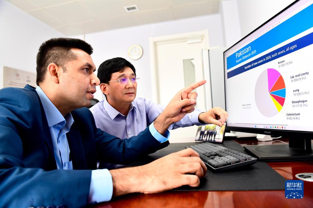10月16日,在山東大學齊魯醫學院,默罕默德·沙巴茲向賈繼輝教授介紹癌癥在巴基斯坦的病發情況。