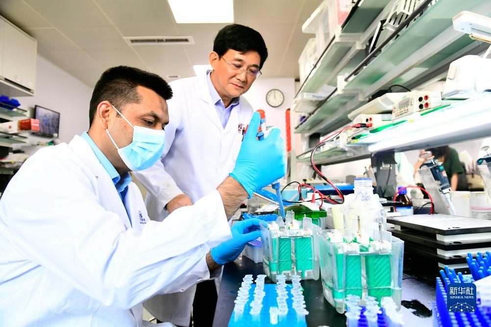 10月16日,在山東大學齊魯醫學院腫瘤研究聯合實驗室,默罕默德·沙巴茲(左)在做實驗。