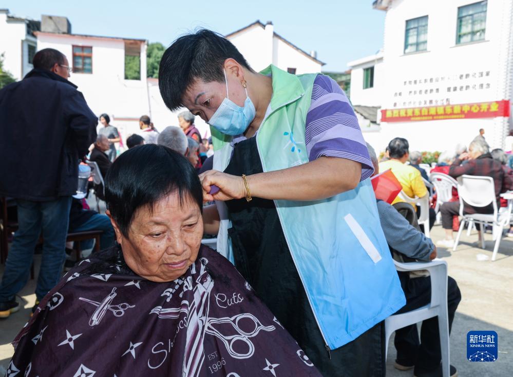 10月17日,志愿者(右)在東白湖鎮樂齡中心給老人理發。