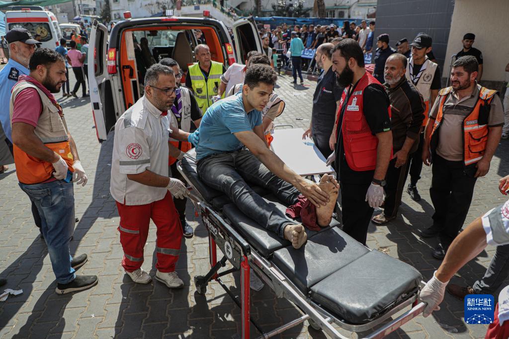10月17日,在加沙城的一家醫院,醫護人員運送傷員。