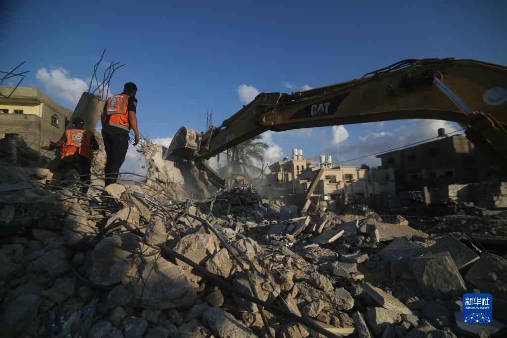 10月16日,在加沙地帶南部城市拉法,人們在遭以色列空襲損毀的建筑廢墟中實施救援。