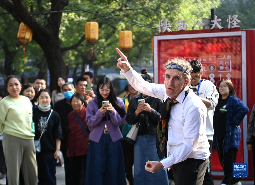 10月16日,來自斯洛伐克法帝西摩劇院的默劇表演藝術家弗拉基米爾·庫利塞克(右前)在西安永興坊進行惠民巡演。