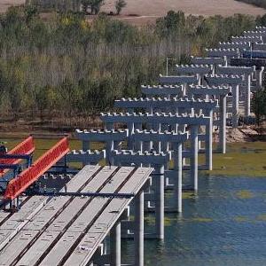 10月17日,工人在唐山灤州市內的秦唐高速公路跨灤河大橋建設工地施工(無人機照片)。