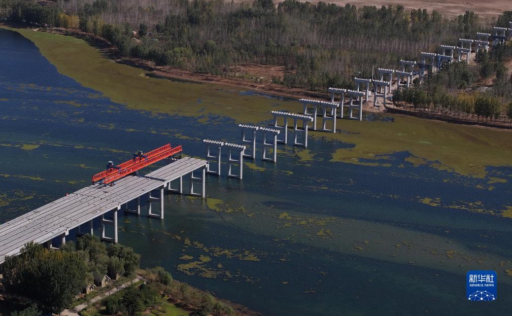 10月17日,工人在唐山灤州市內的秦唐高速公路跨灤河大橋建設工地施工(無人機照片)。