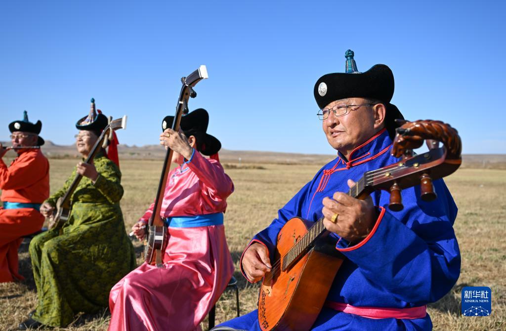 牧忙喂牛羊,閑時撫琴瑟。秋忙之余,道爾吉與父親明安寶會參加當地一項特色文藝活動——“乃日”?!澳巳铡笨勺g為“禮樂”“娛樂”“聚會”,起源于元代,是一種以樂器歌舞為主的綜合性民間表演藝術,被列入內蒙古自治區級非物質文化遺產名錄。