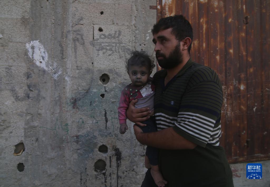 10月17日,在加沙地帶南部城市拉法,一名男子抱著受傷的孩子。