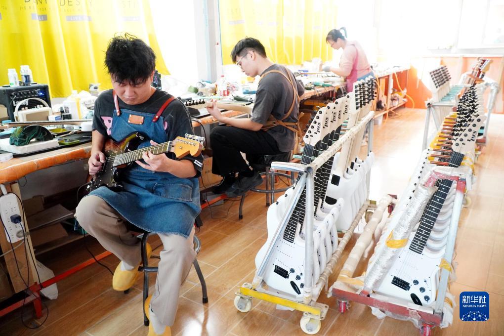 10月17日,在山東省昌樂縣鄌郚鎮的一家樂器生產企業,工作人員在調試電吉他產品。