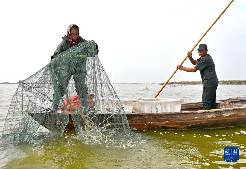 10月17日,在河北省唐山市曹妃甸區,水產養殖戶在捕撈利用鹽場鹽田鹵水養殖的南美白對蝦。
