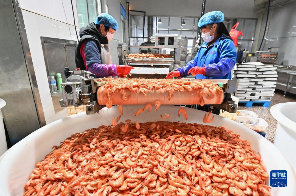 10月17日,工人在河北省唐山市曹妃甸區一家水產加工企業的南美白對蝦加工生產線上工作。