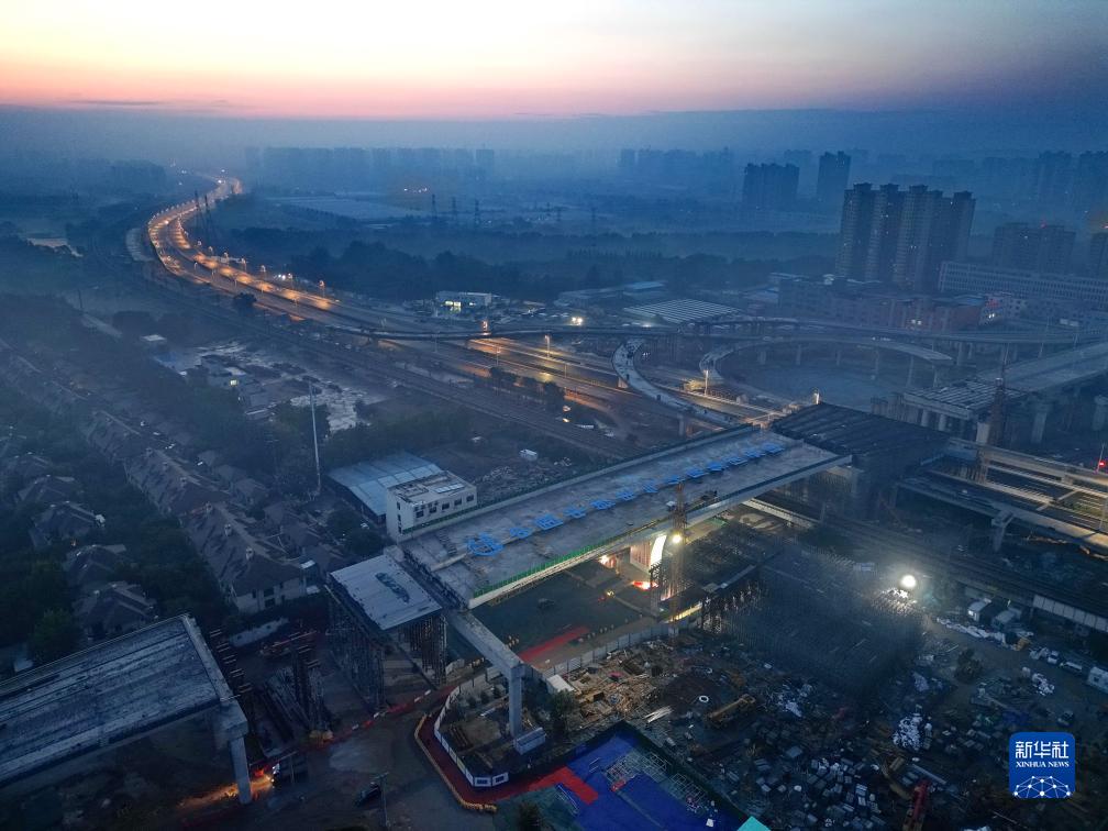 石家莊市中華北大街上跨西環線鐵路T型剛構橋成功轉體(10月18日攝,無人機照片)。