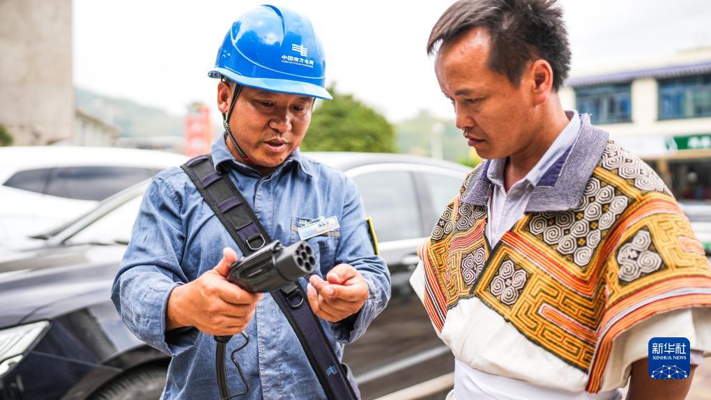 在六盤水市鐘山區青林苗族彝族鄉灰依村,南方電網六盤水供電局工作人員在指導當地群眾如何正確使用充電樁(9月22日攝)。