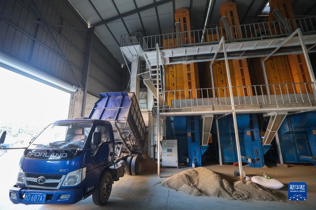 10月17日,在諸暨市蒼湖糧食專業合作社的加工車間里,剛收獲的稻谷在自動化機器內進行烘干。