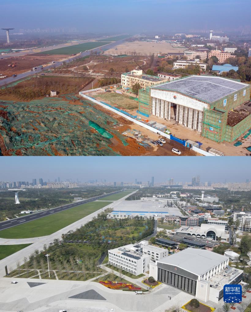 這是一張拼版照片:上圖為2022年11月25日拍攝的已停用的合肥駱崗機場,右下角為曾經的機庫(無人機照片,新華社發 黃洋洋攝);下圖為2023年10月17日拍攝的合肥駱崗公園,機庫已改造為藝術廳(無人機照片,新華社記者周牧攝)。