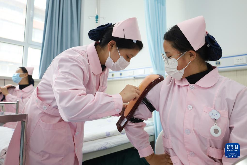 10月17日,在甘肅省蘭州新區科教園區,甘肅省衛生職業學院的學生在基礎護理實訓室進行實訓課程。