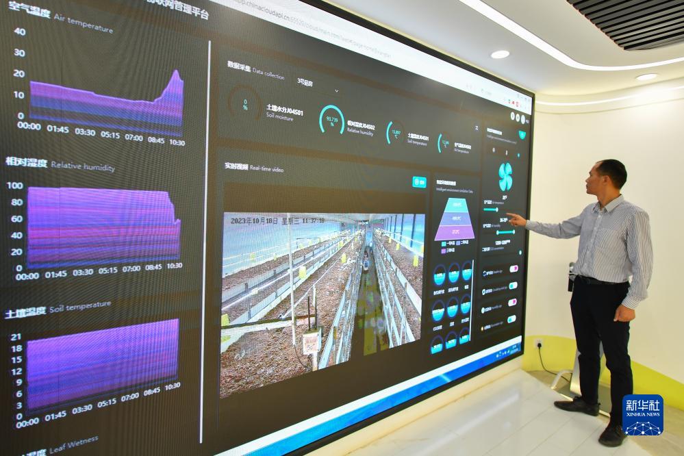 10月18日,在湘潭市雨湖區姜畬鎮泉塘子村,一家食用菌生產企業的工作人員在介紹用于菇房管理的5G智慧農業物聯網系統。