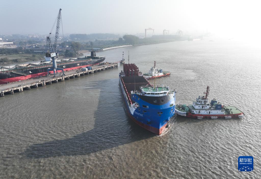 10月18日,中遠海運萬噸級電動集裝箱船離開碼頭準備試航(無人機照片)。