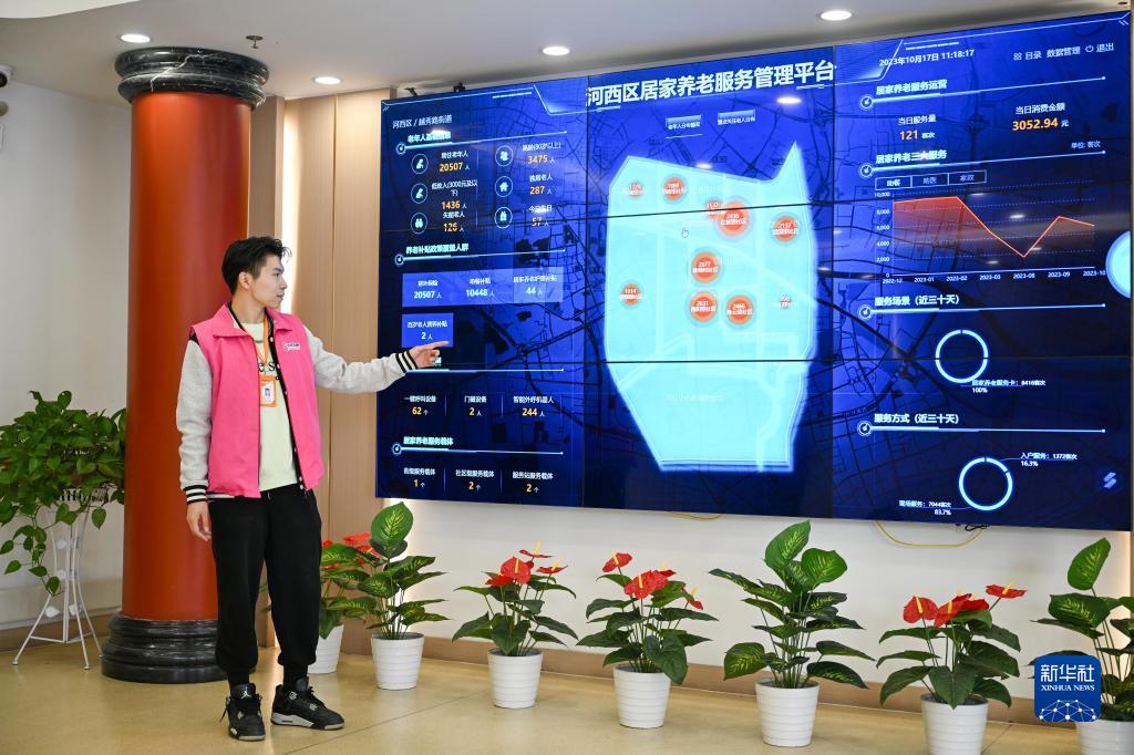 10月17日在天津市河西區越秀路街道居家養老服務中心內拍攝的河西區智慧養老服務管理平臺可視化大屏。