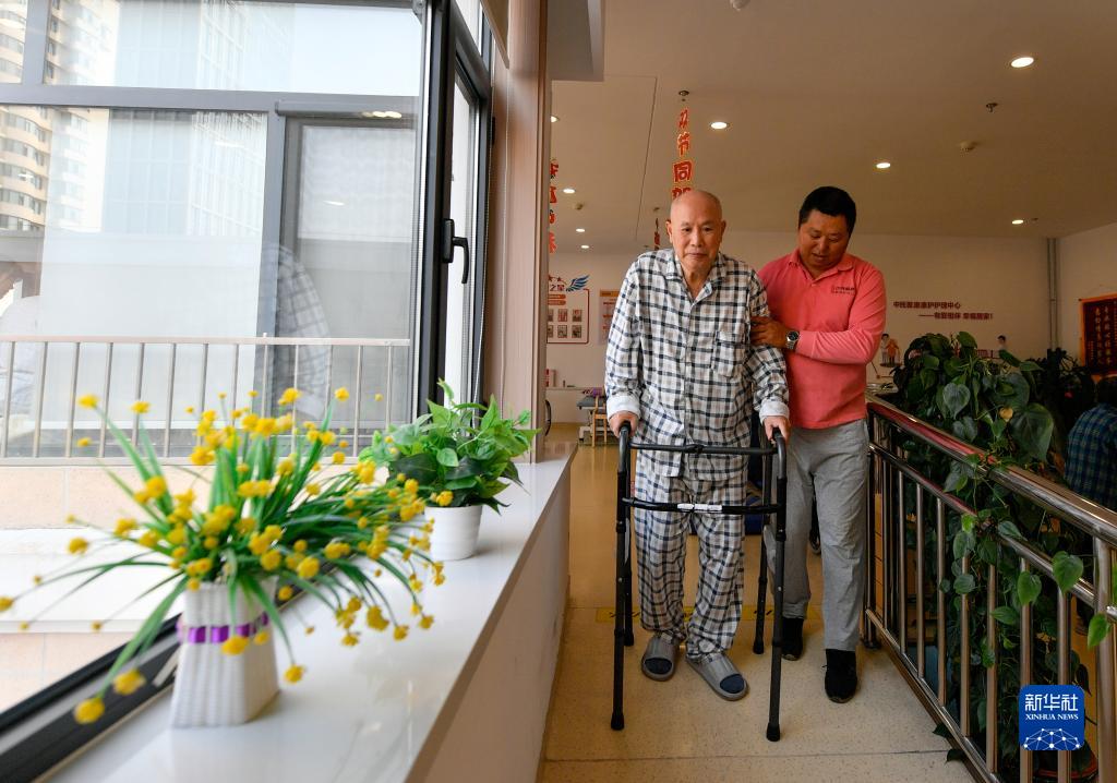 10月17日,在天津市河西區越秀路街道居家養老服務中心,工作人員攙扶老人在無障礙坡道上行走。