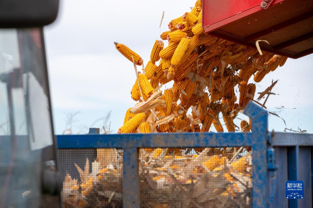 10月18日,在黑龍江省綏化市北林區張維鎮潤地農業種植合作社的一處玉米地,收割機卸下剛剛收獲的玉米。