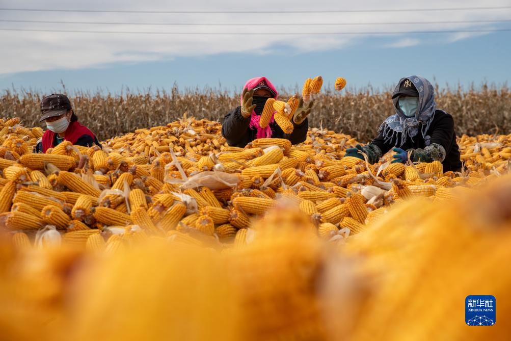 10月18日,在黑龍江省綏化市北林區張維鎮潤地農業種植合作社晾曬場,村民在擺放剛剛收獲的玉米。