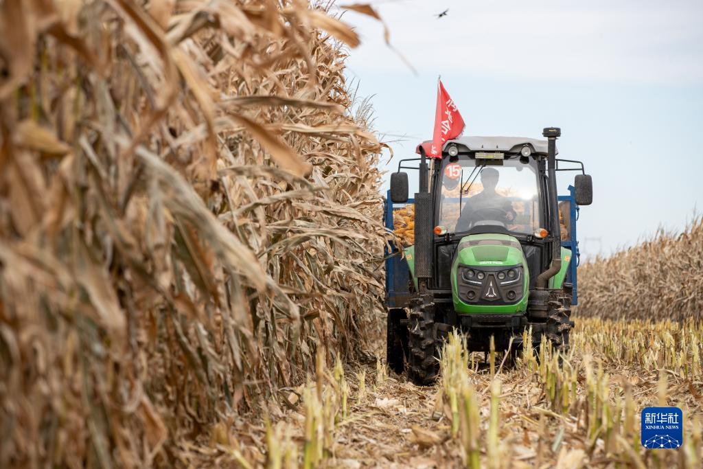 10月18日,在黑龍江省綏化市北林區張維鎮潤地農業種植合作社的一處玉米地,拖拉機運輸剛剛收獲的玉米。