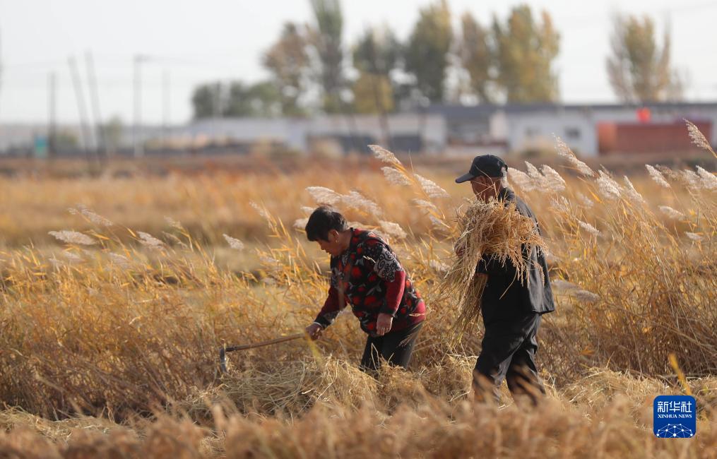 10月18日,在鄂爾多斯市達拉特旗昭君鎮沙圪堵村,農民在田間收割水稻。