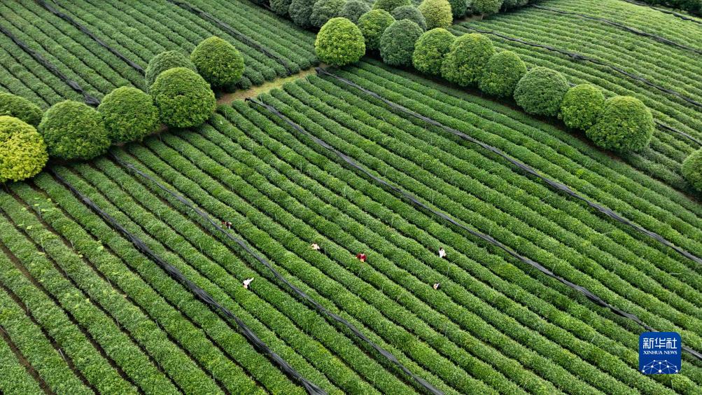 10月18日,茶農在貴州省遵義市鳳岡縣永安鎮田壩社區茶園內采摘秋茶(無人機照片)。