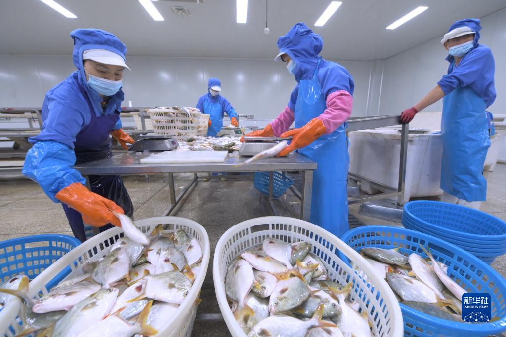 10月17日,位于中印尼“兩國雙園”的福建淼天匯食品有限公司員工在挑選準備出口到印尼的魚產品。