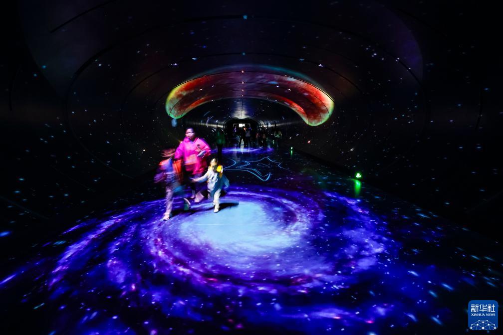 10月18日,在第81屆世界科幻大會主場館——成都科幻館內,人們走在“時空隧道”內。