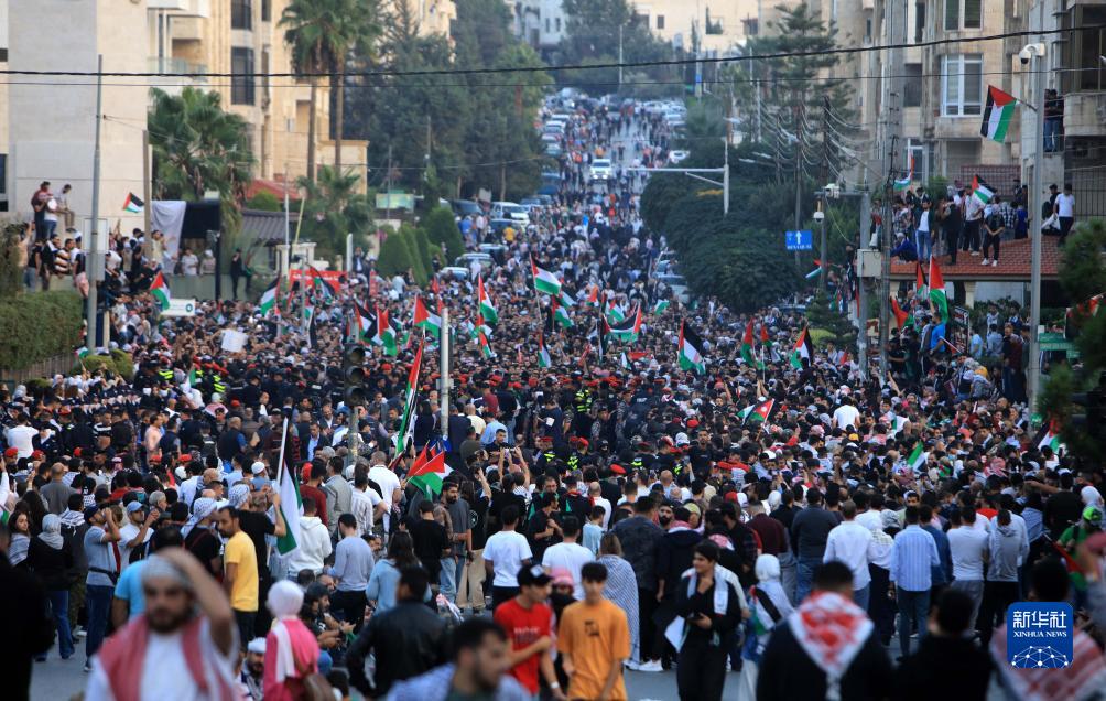10月18日,人們在約旦安曼的以色列駐約旦大使館附近舉行集會。