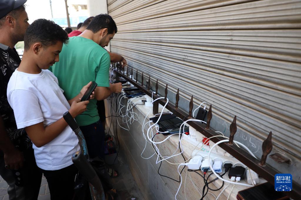10月18日,在加沙地帶南部城市汗尤尼斯,人們給手機充電。