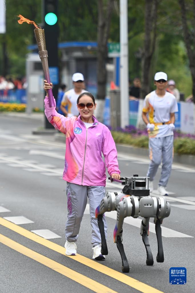 10月19日,火炬手蔡瓊卉在智能導盲犬的引導下進行火炬傳遞。這是智能導盲犬首次在大型賽事火炬傳遞中亮相,它以四足智能機器人視覺識別能力引導視障殘疾人行走。