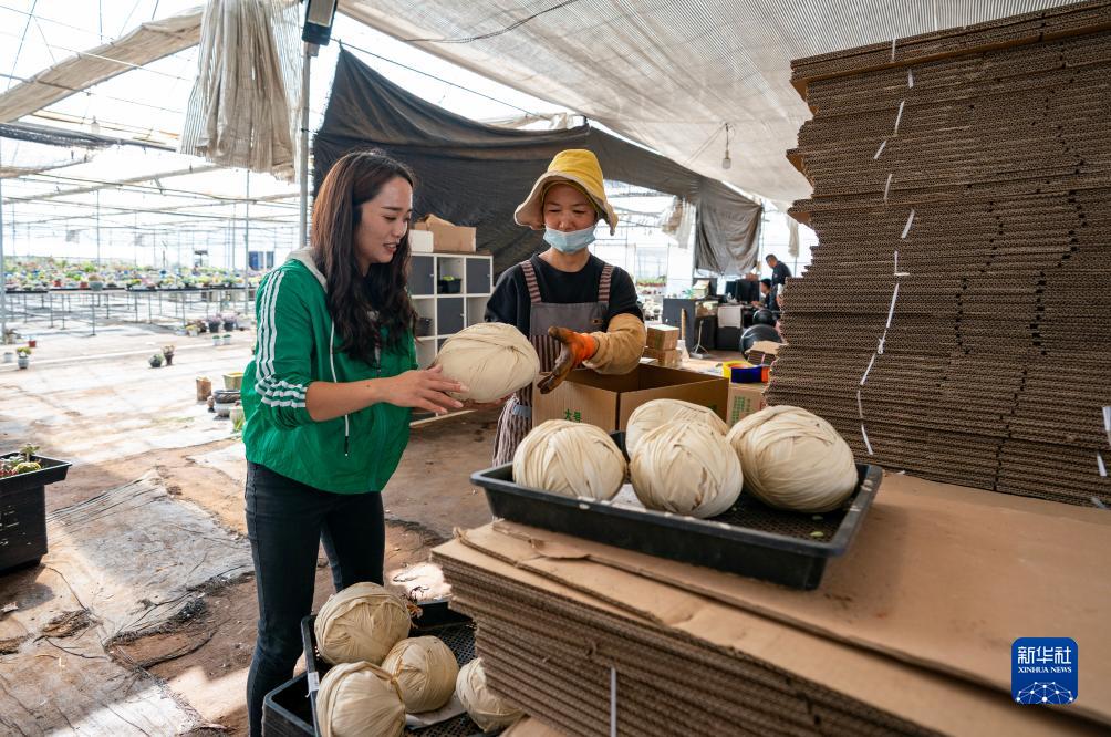 10月18日,李思敏(左)在位于晉寧區寶峰街道的多肉植物直播基地內幫助同事打包裝箱。