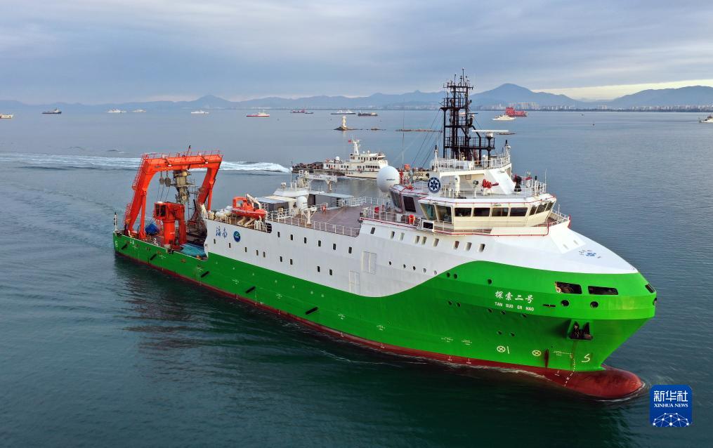 完成對南海西北陸坡一號和二號沉船第二階段考古調查的“探索二號”科考船攜“深海勇士”號載人潛水器抵達三亞(無人機照片,10月10日攝)。