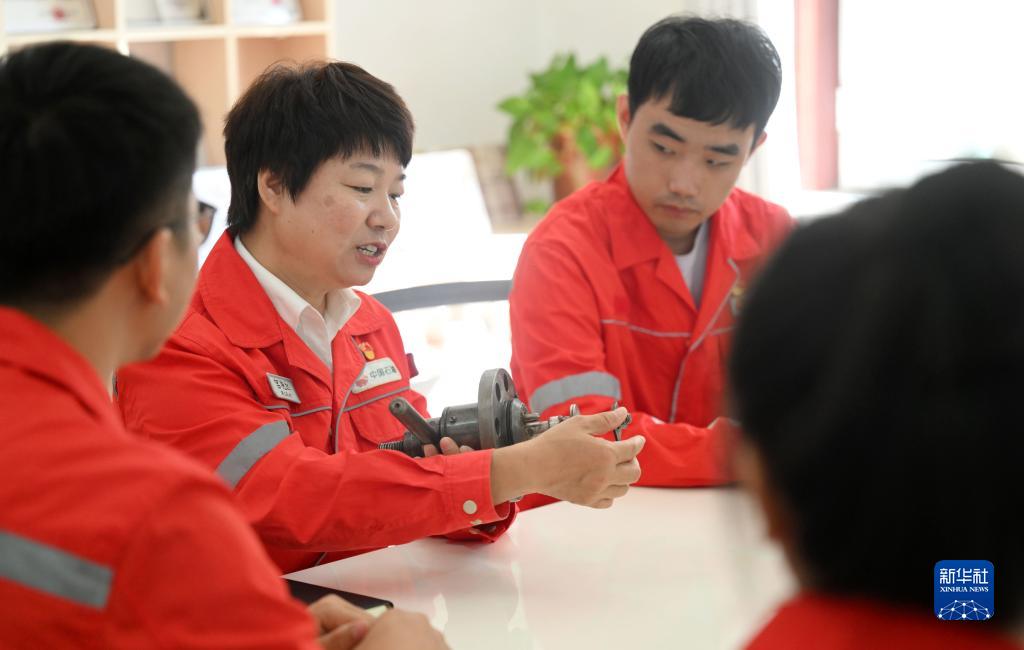 10月18日,在中國石油大港油田第三采油廠“宮艷紅勞模創新工作室”,宮艷紅(左二)和工作室成員討論設計方案。