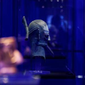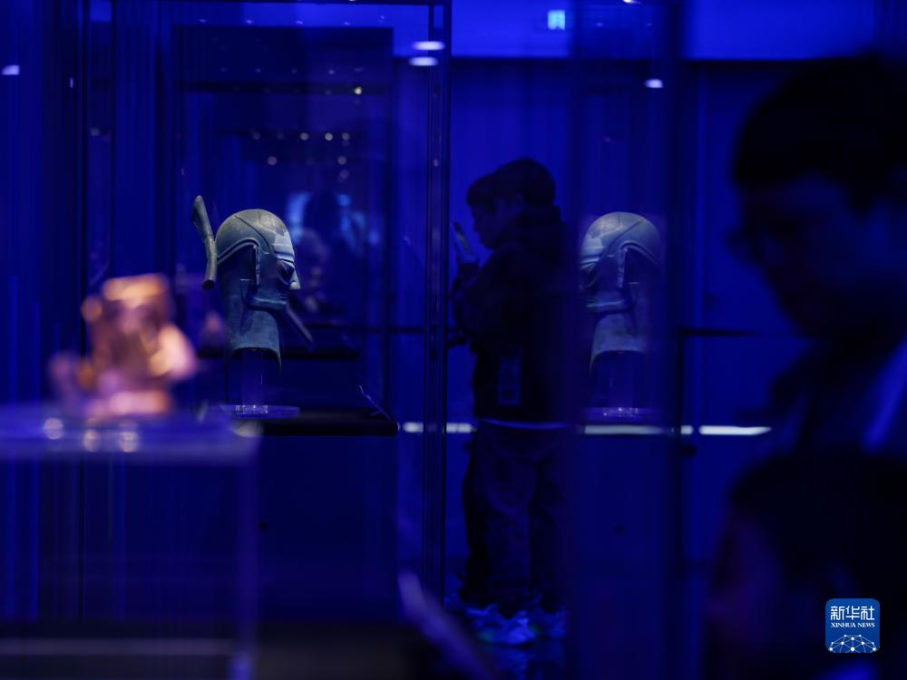 10月19日,在2023成都世界科幻大會主場館雨果廳,觀眾在觀看金沙遺址出土文物的仿制品。