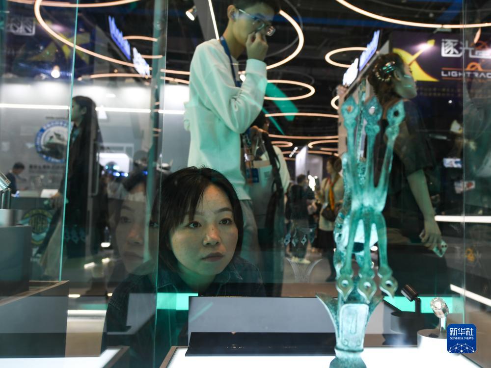 10月19日,在2023成都世界科幻大會主題展覽上,觀眾在參觀三星堆遺址出土文物的仿制品。