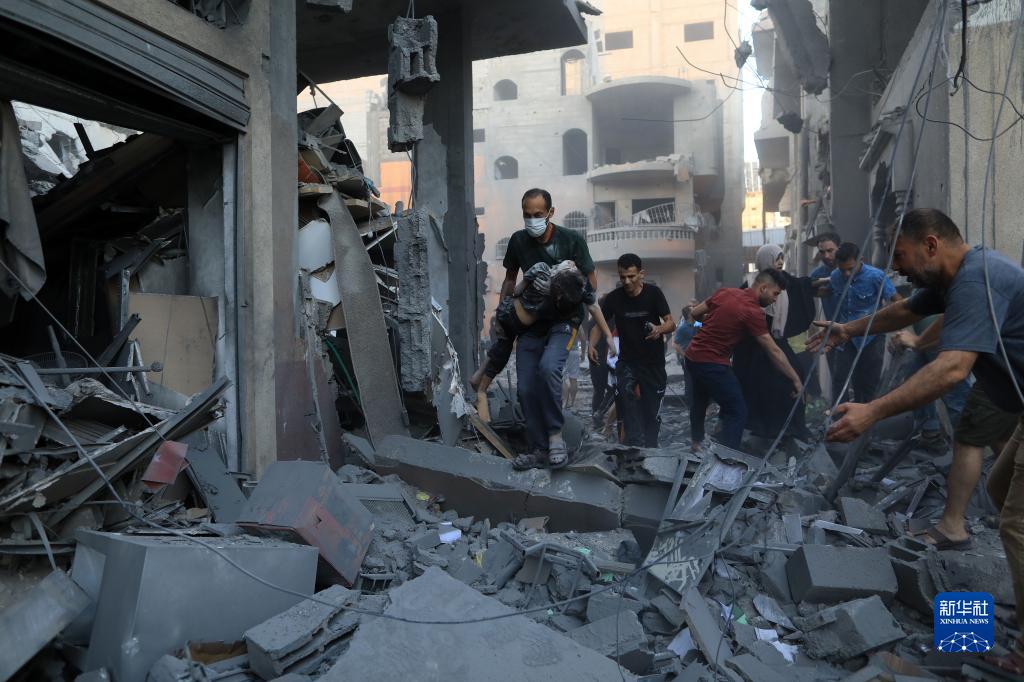 10月19日,在加沙地帶南部城市汗尤尼斯,人們在遭以色列空襲后的建筑廢墟中救援傷者。