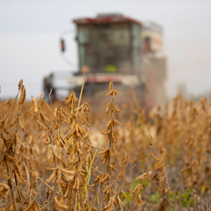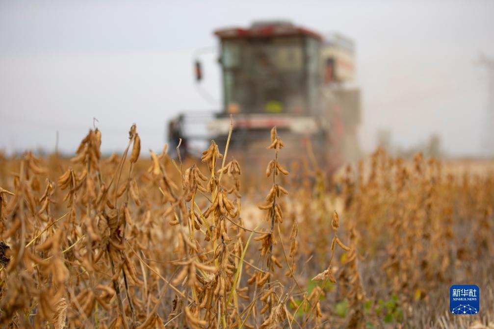 10月19日,在山東省東營市廣饒縣李鵲鎮西張莊村玉米大豆帶狀復合種植田里,農民駕駛收割機收獲大豆。