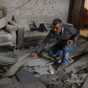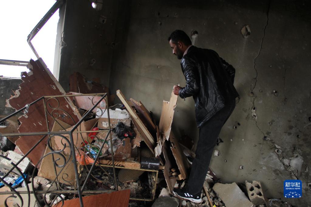 10月19日,在黎巴嫩南部黎以邊境附近一村莊,一名居民正在查看房屋受損情況。
