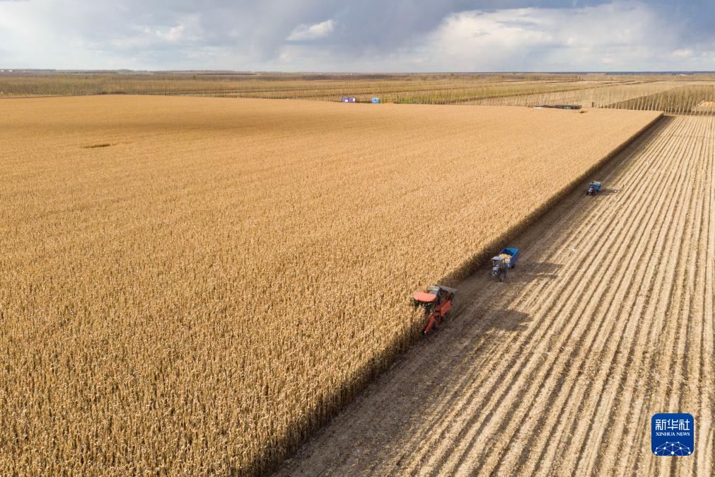 10月19日,在黑龍江省肇東市五里明鎮東升村,農民駕駛收割機在收獲玉米(無人機照片)。