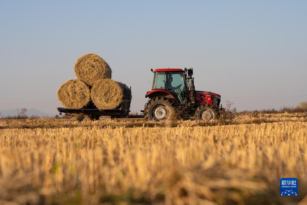 10月18日,在黑龍江省尚志市河東朝鮮族鄉,農民駕駛拖拉機運輸打捆后的秸稈。