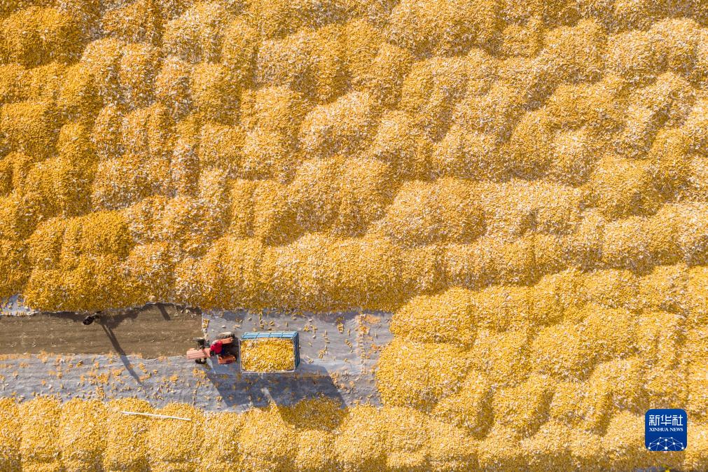 10月19日,在黑龍江省肇東市五里明鎮東升村,農民把收獲的玉米運到當地農業合作社指定的地點進行晾曬(無人機照片)。