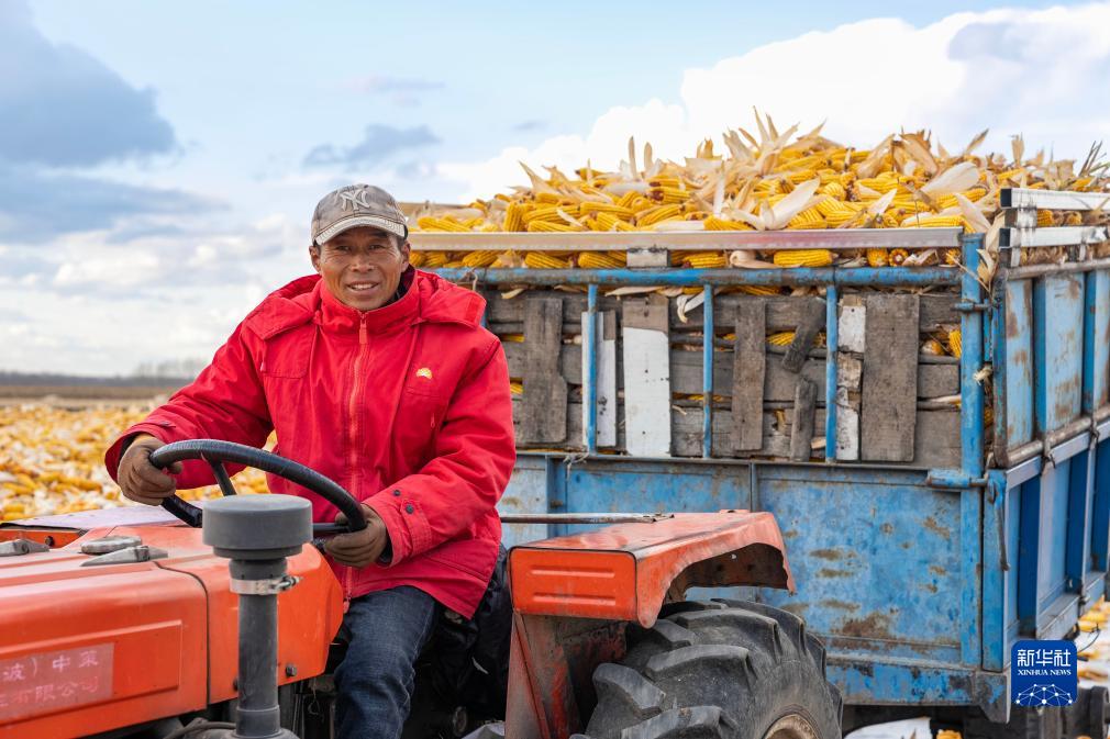 10月19日,在黑龍江省肇東市五里明鎮東升村,農民在運輸剛收獲的玉米。